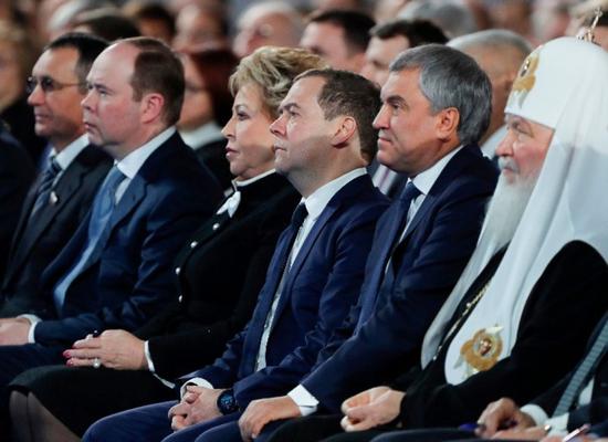1月15日,俄羅斯總理梅德韋杰夫(右三)在莫斯科聽俄總統(tǒng)普京發(fā)表國情咨文。