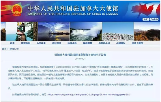 近日,中國人民共和國駐加拿大大使館發(fā)布消息:入境加拿大,微信、瀏覽器、移動設(shè)備的儲存文件等都有可能被查,若拒絕檢查或?qū)⒈或?qū)逐遣返。