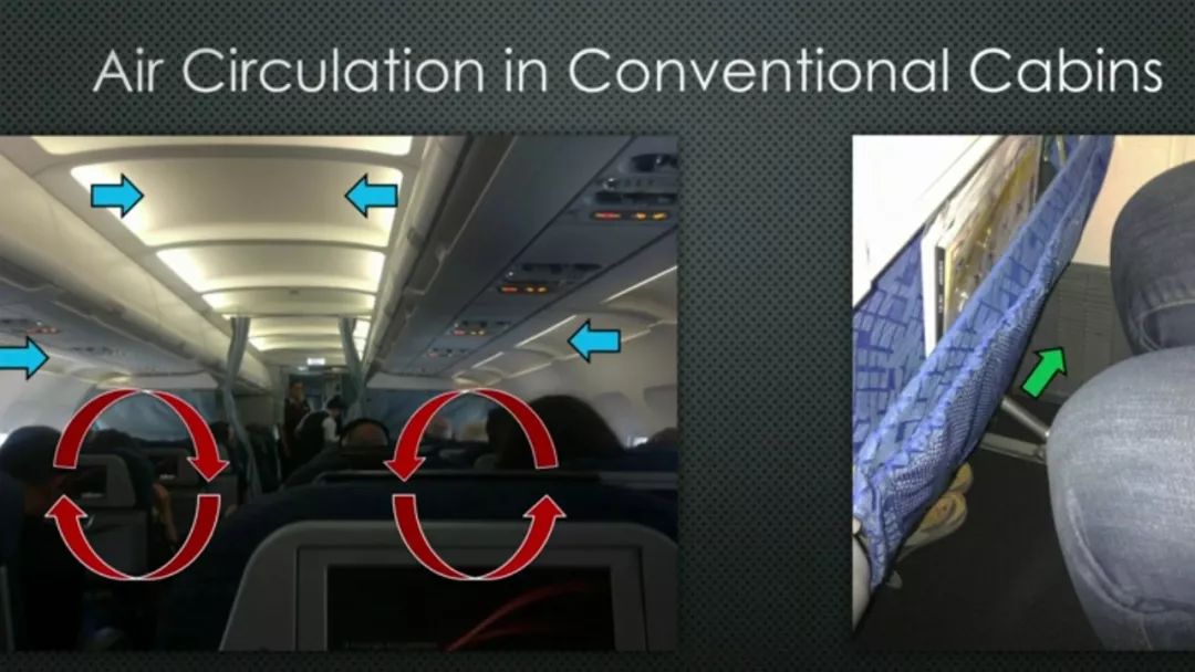 而對其他的乘客,這種危險并不顯著,因為客艙空氣在橫斷面上循環(huán),飛沫的播散被限制在少數(shù)幾排座位。
