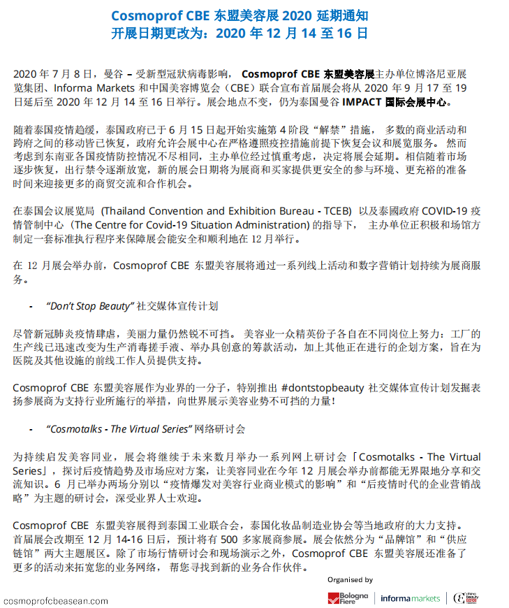 2020年7月8日,曼谷-受新型冠狀病毒影響,CosmoprofCBE東盟美容展主辦單位博洛尼亞展覽集團、Informa Markets和中國美容博覽會(CBE) 聯(lián)合宣布首屆展會將從2020年9月17至19日延后至2020年12月14至16日舉行。展會地點不變,仍為泰國曼谷IMPACT國際會展中心。