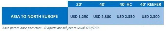 從亞洲到北歐,各式貨柜自2020年8月1日(原產(chǎn)地港裝貨日期)起,直至另行通知(但不超過(guò)2020年8月14日),新的可適用的各類(lèi)運(yùn)費(fèi)FAK如下: