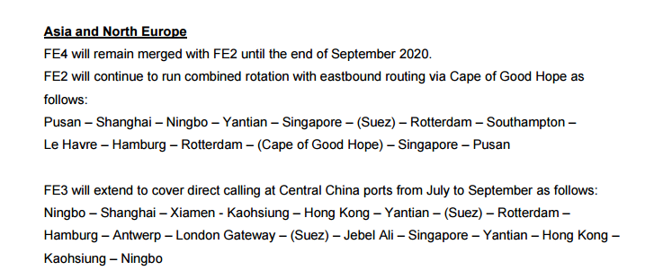 其中,亞洲-北歐航線方面,到9月底FE4繼續(xù)與FE2合并,F(xiàn)E3航線在7-9月間,將直掛中國(guó)華中港口,掛靠路線為寧波、上海、廈門(mén)、高雄、香港、鹽田、(蘇伊士)、鹿特丹、漢堡、安特衛(wèi)普、倫敦門(mén)戶(hù)、(蘇伊士)、杰貝阿里、新加坡、鹽田、香港、高雄、寧波。