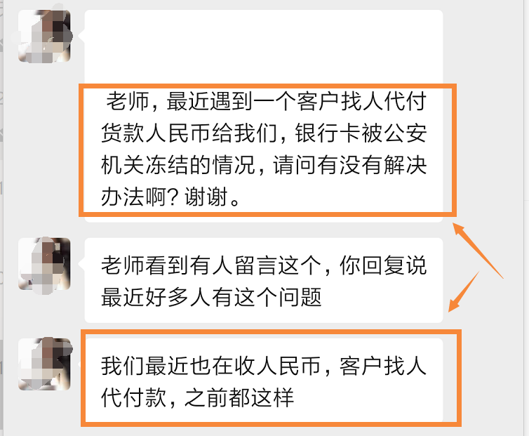 都是反饋,客戶找人代付人民幣貨款,結果收到款后賬戶就被公安機關凍結了。而且很長時間也無法解凍,嚴重影響正常的貿(mào)易活動,及企業(yè)經(jīng)營和個人生活。