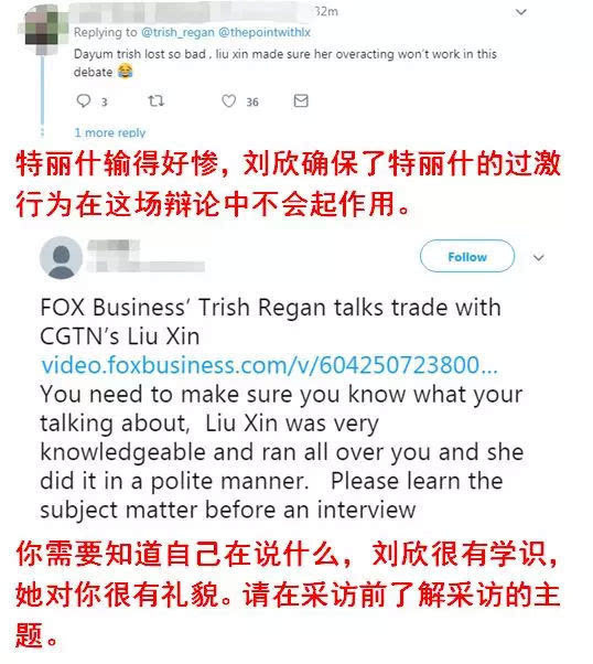 在開場白中,劉欣表示:“非常感謝崔西,感謝你給我這次機(jī)會,從來沒有想過能和你進(jìn)行直接對話。”但這個(gè)30秒的開場白,卻被崔西至少三次插話。在與崔西·里根的對話中,劉欣談及了中美貿(mào)易、知識產(chǎn)權(quán)等話題。