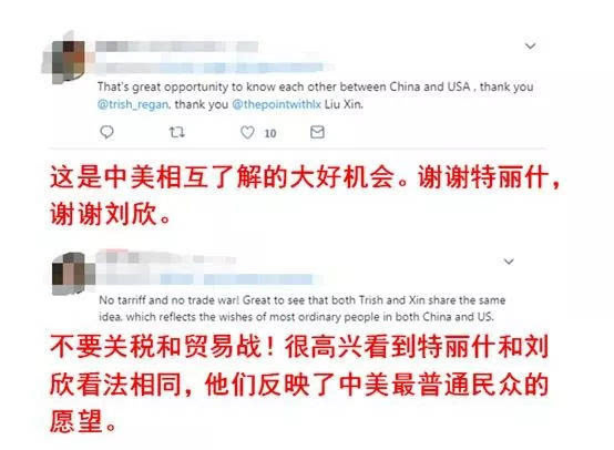 崔西·里根在節(jié)目中問劉欣能不能談一下對中美貿(mào)易談判的個(gè)人看法。劉欣回答說:“我并沒有內(nèi)部消息,所以我并不太清楚中美之間的貿(mào)易談判,究竟到達(dá)一個(gè)什么樣的地步,但是我認(rèn)為中國政府已經(jīng)非常明確地表明了立場。”
