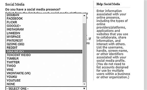 3日,澎湃新聞(www.thepaper.cn)記者登錄美國國務(wù)院“領(lǐng)事電子申請中心”網(wǎng)站后確認,目前,在線申請系統(tǒng)中已加入一個新的環(huán)節(jié),即填寫過去5年在20個社交網(wǎng)頁上使用過的個人賬號,這些社交平臺涉及到中國國內(nèi)的豆瓣、QQ空間、新浪微博、騰訊微博、優(yōu)酷等社交媒體,也包括國外流行的社交平臺如Facebook、Flickr、Google +、Instagram、LinkedIn、Reddit、Tumblr、Twitter和YouTube等網(wǎng)站。