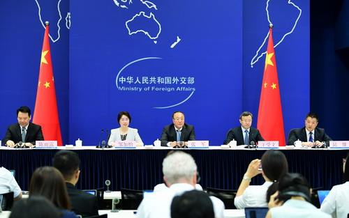 2019年6月24日,外交部舉行中外媒體吹風會。中方二十國集團(G20)事務協(xié)調(diào)人、外交部部長助理張軍,財政部副部長鄒加怡,商務部副部長兼國際貿(mào)易談判副代表王受文,人民銀行副行長陳雨露介紹國家主席習近平即將出席二十國集團領導人第十四次峰會有關情況,并回答記者提問。