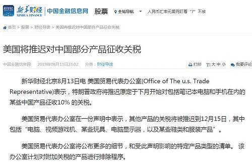 關(guān)于中美貿(mào)易爭(zhēng)端昨晚突發(fā)兩則重磅消息:一則是據(jù)新華財(cái)經(jīng)消息,美國(guó)貿(mào)易代表辦公室表示,特朗普政府將推遲原定于下月開(kāi)始對(duì)包括筆記本電腦和手機(jī)在內(nèi)的某些中國(guó)產(chǎn)品征收10% 的關(guān)稅。