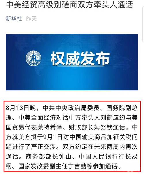 目前,全球資本市場(chǎng)廣大投資者關(guān)注的目光均集中在未來(lái)中美雙方經(jīng)貿(mào)談判如何進(jìn)行方面。最新的消息顯示,中美雙方代表昨日晚通了電話,中方就美方擬于9月1日對(duì)中國(guó)輸美商品加征關(guān)稅問(wèn)題進(jìn)行了嚴(yán)正交涉。
