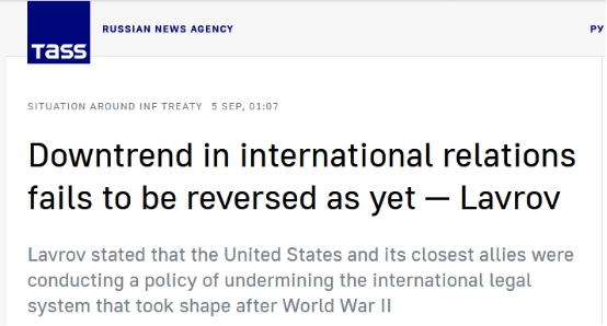 “這(種破壞)包括過去幾十年里(俄羅斯與美國)在戰(zhàn)略穩(wěn)定和軍備控制方面達成的協(xié)議。21世紀(jì)初,《反彈道導(dǎo)彈條約》被(美國)單方面終止?,F(xiàn)在,《中導(dǎo)條約》也已失效。與此同時,續(xù)簽《削減戰(zhàn)略武器條約》的前景也并不明朗”,拉夫羅夫總結(jié)說,二戰(zhàn)后以普遍共識為基礎(chǔ)建立的國際法體系正面臨著嚴峻的考驗。