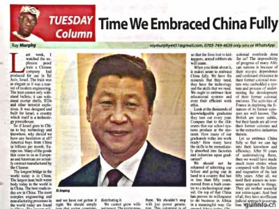 14日,尼日利亞主流媒體《領(lǐng)導(dǎo)者報》 使用整版封底刊登專欄文章“全面擁抱中國時不我待”,積極評價中國在各領(lǐng)域取得的全方位成就,呼吁尼各界主動學(xué)習(xí)中國,積極擁抱中國資金、中國技