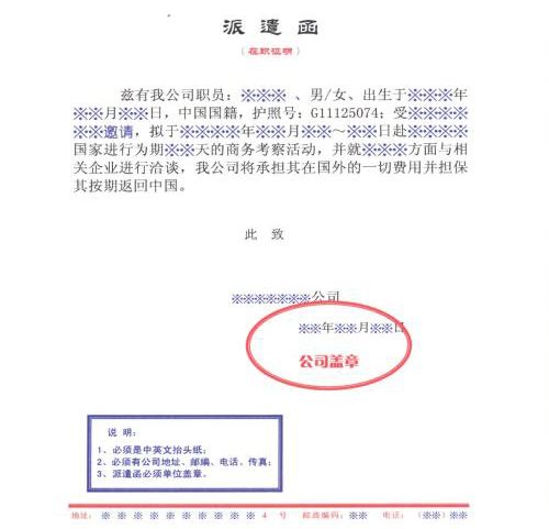 * 中方公司派遣函 原件 查看樣例