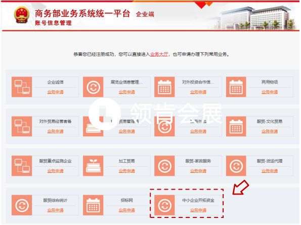 步驟 3:新用戶完成統(tǒng)一平臺(tái)賬號(hào)注冊(cè)后,頁(yè)面將跳轉(zhuǎn)進(jìn)入應(yīng)用選取頁(yè),用戶點(diǎn)擊“中小企業(yè)開(kāi)拓資金”下方的“業(yè)務(wù)申請(qǐng)”按鈕進(jìn)行應(yīng)用選取。